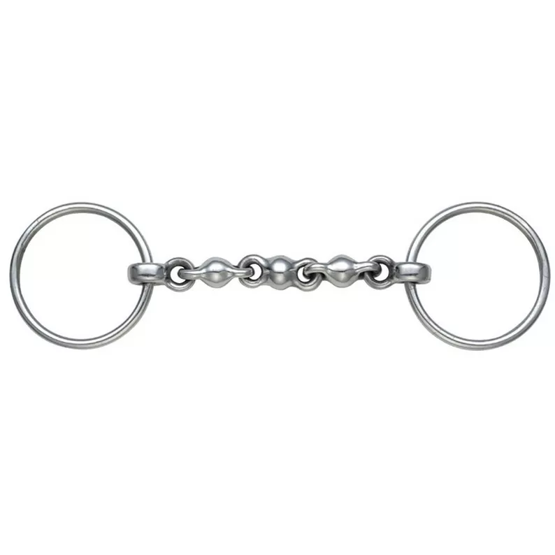 The Waterford bit consists of a multitude of ball-shaped links. This gives it a flexible, articulated structure, allowing it to conform closely to the shape of the horse’s mouth. The mouthpiece encourages horses to play with the links and typically reduces pulling or leaning on the reins.